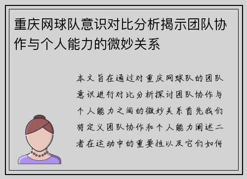 重庆网球队意识对比分析揭示团队协作与个人能力的微妙关系